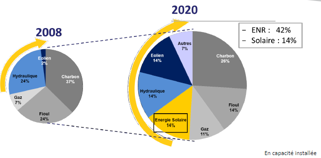 Besoins énergétiques.La demande en énergie électrique s’accroît en moyenne de 6% par an au Maroc. En 2009, au moment où la décision de développer le solaire a été prise, les énergies renouvelables représentaient 33% du mix énergétique national, c’est-à-dire de la production locale d’électricité. D’ici 2020, cette part doit être portée à 42%.