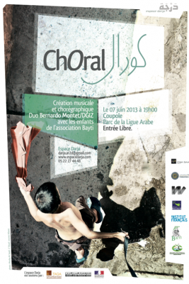 Le projet ChOral est mené par deux artistes internationaux, Bernardo Montet, chorégraphe français et ancien directeur du centre chorégraphique national de Tours et Dgiz, musicien issu du rap, du slam et du hip hop, en collaboration avec la chorégraphe Meryem Jazouli, directrice artistique de l’Espace Darja Casablanca. Cette collaboration qui fait travailler ensemble des acteurs partageant les mêmes préoccupations (développement de la danse contemporaine dans des pays où elle est émergente), permettra aux enfants de Bayti, en situation difficile, durant 5 jours d’atelier de danse et de chorale, de prendre la parole puis de la partager lors d’une représentation publique le vendredi 7 juin à 19h.