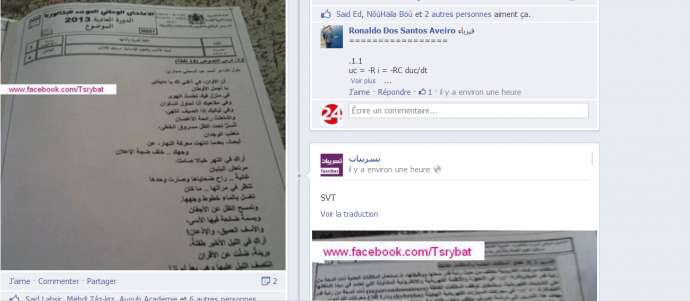 Il est trop tôt pour connaître l’étendue des dégâts, mais ce matin, plusieurs pages Facebook (ici, ici et ici), entre autres, toutes intitulées « Tasribat » (fuites) ont diffusé, quasiment en temps réel, les sujets du baccalauréat dans plusieurs branches et différentes matières, au moment même ou peu de temps après leur distribution dans les salles d'examen.