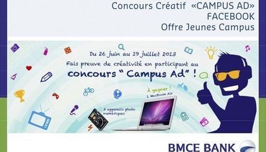 Le concours « Campus Ad » est mis en ligne sur la page facebook de la BMCE Bank du 26 juin au 19 juillet 2013. Il invite les jeunes talents créatifs de cette communauté à élaborer une publicité créative sur sa nouvelle offre bancaire destinée aux jeunes étudiants intitulée Jeune Campus, qu’elle soit vidéo, audio, image, flash ou texte.