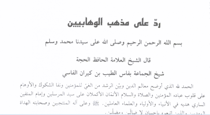 Nous reprenons ci-dessus, en fac similé, des reproductions des réfutations de Cheikh Et-Tayeb Benkirane aux missives wahabites. Les tentations wahabites continuent jusqu’à nos jours : de Mohamed Ibn Abdelwahab jusqu’aux écoles coraniques salafistes, c’est la même volonté d’imposer une vision fermée, archaïque et totalitaire du monde. Le combat continue.
