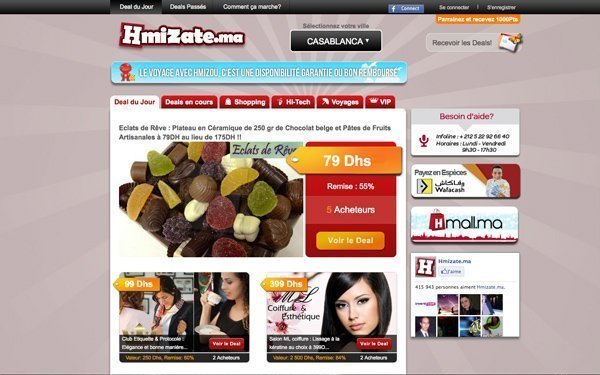 Lancé en janvier 2011 par Kamal Reggad, Hmizate.ma propose des promotions dans plusieurs catégories (restaurants, sorties, voyages, ...) à condition de rassembler un certain nombre d'acheteurs.