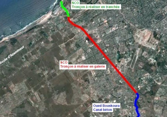 Une première partie sera raccordée à l’Oued Bouskoura, il s’agit d’un canal en béton d’une longueur de 2,8 km il sera ensuite relié à un conduit de 6,2 km qui sera constitué d’une partie souterraine de 5,2 km de longueur et d’un kilomètre construit en dalot.