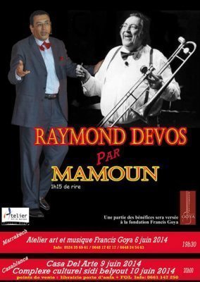 Mamoun interprète les sketches de Raymond Devos, de l'humour fin et des jeux de mots à gogo! A casablanca : - Le 09 juin 2014 à la Casa del Arte à 20h00; - Le 10 juin 2014 au Cxe culturel Sidi belyout à 20h00. Les tickets en vente à la librairie porte d'Anfa et à la La Fédération des œuvres laïques (FOL) A Marrakech : - Le 06 juin 2014 à l'atelier art et musique Francis Goya à 19h30. Pour plus d'informations sur la vente des billets : Tél. : 0524-35 69 61 - 0648 17 67 17 // 0648 24 54 63