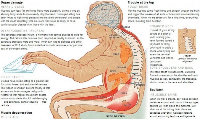 Cette position adoptée par une majorité d’employés de bureaux entraîne des douleurs de dos, des dégénérescences musculaires en raison d’un manque d’activité, des maladies cardiaques, des diabètes, des cancers du colon et causent même, dans les cas les plus extrêmes, des décès prématurés pour les plus sédentaires, alertent les spécialistes, assistant à ce qui est en passe de devenir un véritable problème de santé publique.