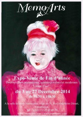 Du 3 au 27 décembre 2014, de 9h30 à 19h30, MemoArts organise l’expo-vente «Cadeaux de fin d’année». Ouvert au public, l’événement est une découverte des œuvres de peintres émérites et de jeunes talents autour du patrimoine marocain : des œuvres d'art orientalistes, contemporaines et modernes ainsi que des livres d’art.