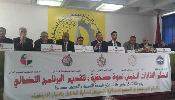 Lors d’une conférence de presse organisée le 15 mars, les leaders de la CDT, UMT, UGTM, FDT-Azzouzi et SNE-Sup ont encore une fois accusé le gouvernement Benkirane de bloquer le dialogue social et annoncé un plan d’action commun.