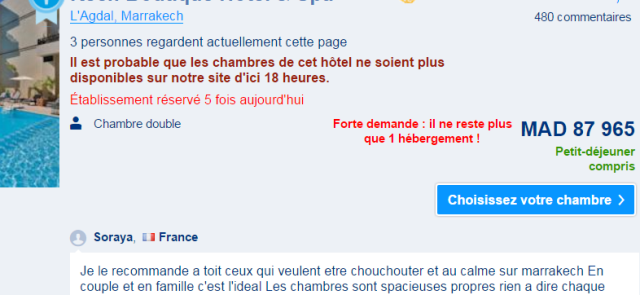 "Il s’agit d’une pratique assez courante lorsqu’il y a une forte demande. Dans les contrats qui lient ces OTA aux hôtels, figure une clause qui oblige ces derniers à garantir une disponibilité de quelques chambres. Or, c’est contraignant. Pour dissuader les clients de réserver et respecter en apparence les termes du contrat, les hôteliers communiquent des prix dissuasifs quand l’hôtel affiche complet", nous explique le voyagiste Fouzi Zemrani.