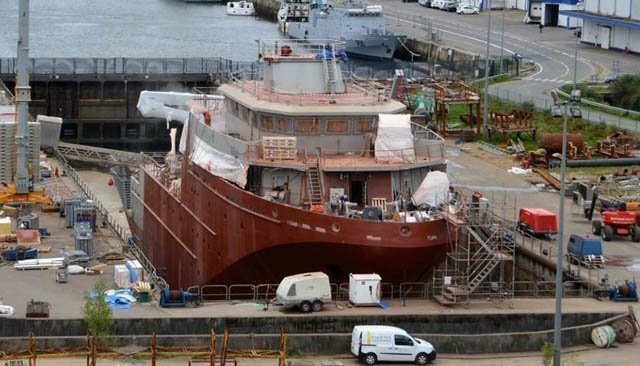 Commandé en 2016 par le Maroc à Kership, société commune de Piriou et Naval Group, le BHO2M, qui fait 72m de longueur, affiche une capacité d’environ 2.600 tonnes. En mai dernier, il était en cale sèche.