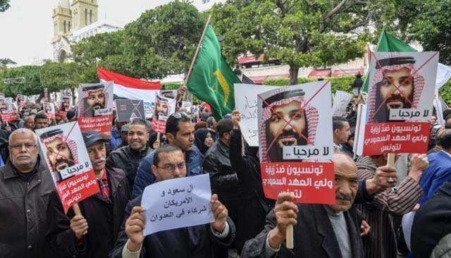 Après des visites aux Emirats arabes unis, à Bahreïn et en Egypte, où les pouvoirs en place ont réitéré leur appui au royaume saoudien, des Tunisiens ont accueilli le prince héritier aux cris de "dégage assassin".