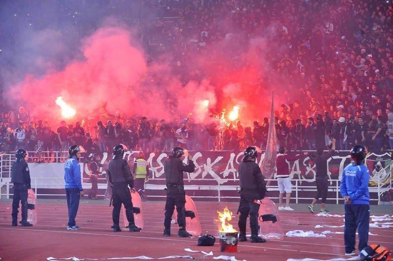Au coup de sifflet final, les supporters ont saccagé le stade Moulay Abdellah à Rabat. Les sièges ont été arrachés et des fumigènes allumées.