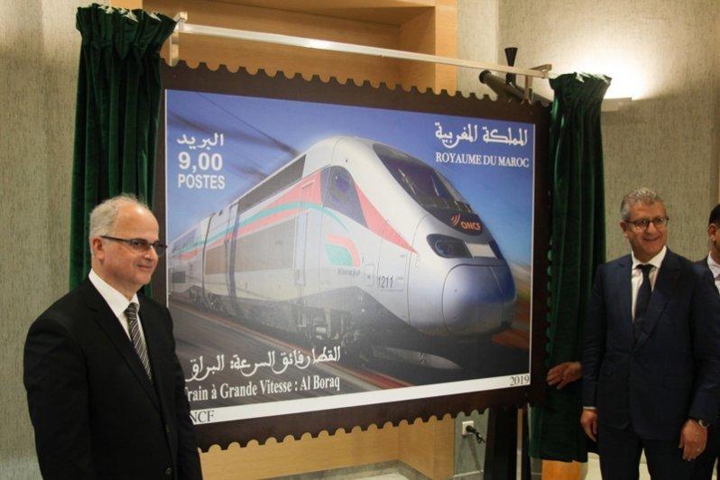 Mohamed Rabie Khlie, DG de l'ONCF, et Amin Benjelloun Touimi, DG du groupe Barid Al-Maghrib, ont lancé jeudi 21 mars le timbre-poste édité à l’effigie du train à grande vitesse "Al Boraq".