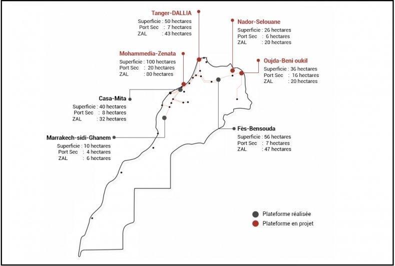 -3 ports secs à Casablanca (Port sec Mita à Ain Sbaâ d’une superficie de 8 ha, Zone industrielle Bensouda à Fès d’une superficie de 5,5 ha et le port sec de Sidi Ghanem à Marrakech d’une superficie de 4,4 ha).