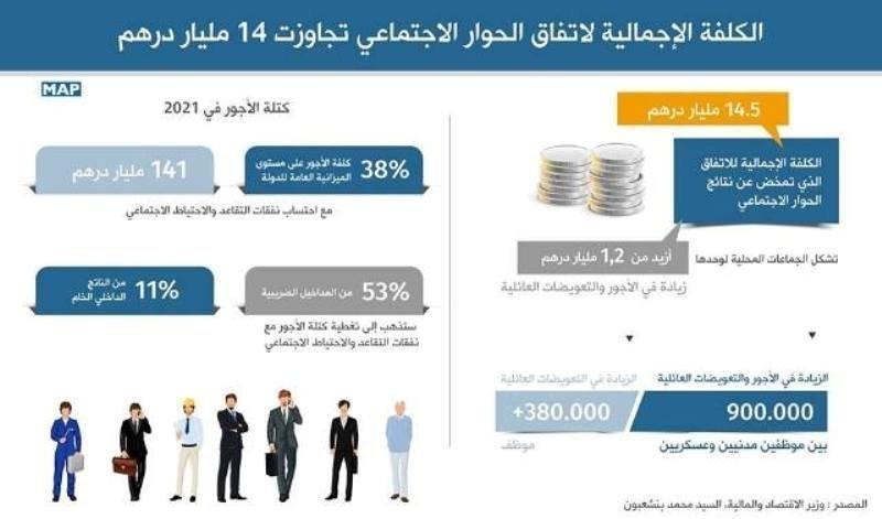 Le coût global de l'accord issu du dialogue social s'élève à 14,5 milliards de DH, dont 1,2 milliard consacré à l'augmentation des salaires et des allocations familiales des fonctionnaires des collectivités locales.