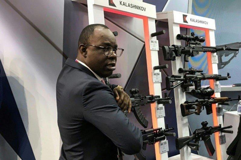 "L'Afrique du Sud utilise des modèles plus anciens. Si vous voulez garder les mêmes munitions, elles seront compatibles avec ces nouvelles armes. On les adapte aux besoins de nos clients", vante un représentant du stand en aidant un homme à prendre en main une kalachnikov dernier cri.