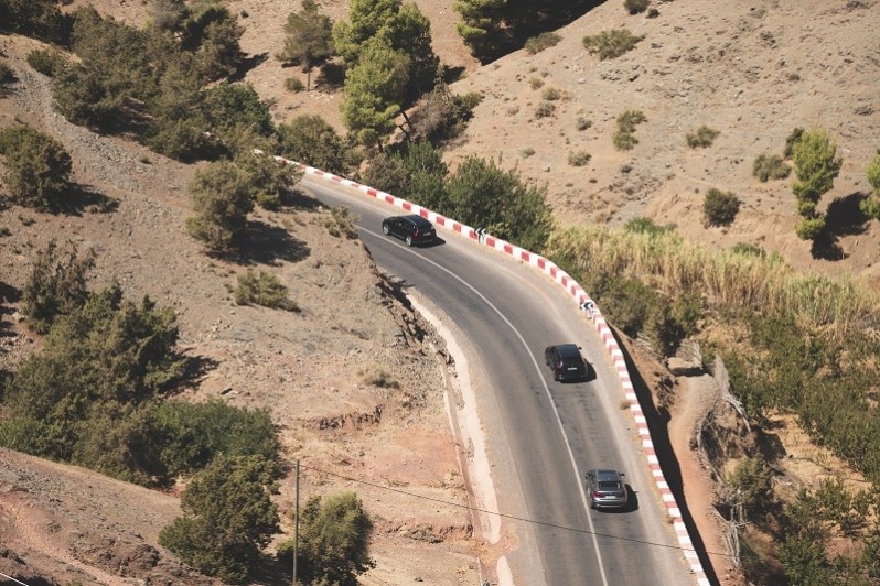 La suite des réjouissances se fait au volant du X4, le “SUV Coupé” compact maison. Nous sommes deux bonnes catégories en dessous, tant en matière de gabarit et de standing qu’en matière de puissance. Mais si le 2.0 l Diesel n’avoue “que” 190 ch, il a suffisamment de ressources pour offrir une conduite active. Surtout, affublé d’une vocation dynamique, ce “Sport Activity Coupé” se dote de suspensions plus fermes et d’un châssis plus agile. Ça tombe bien : il nous sert de monture sur un tronçon sinueux qui remonte les flancs de montagne du Haut Atlas.