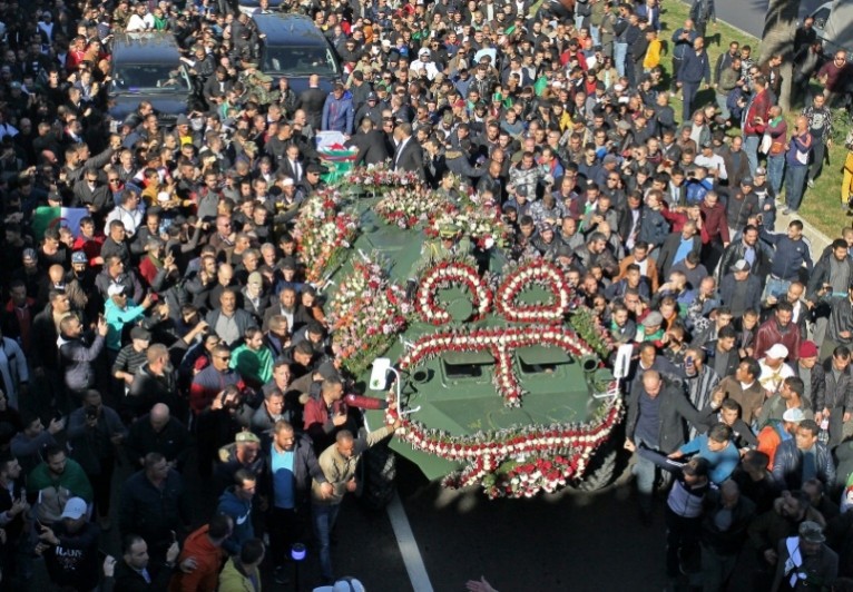 Exposés durant quatre heures au Palais du peuple, bâtiment d'apparat du centre de la capitale, sa dépouille, devant lequel hauts dignitaires et citoyens se sont recueillis, a ensuite pris, sur un affût de canon tiré par un véhicule de transport de troupes blindé, le chemin du cimetière d'El Alia, à une dizaine de km.