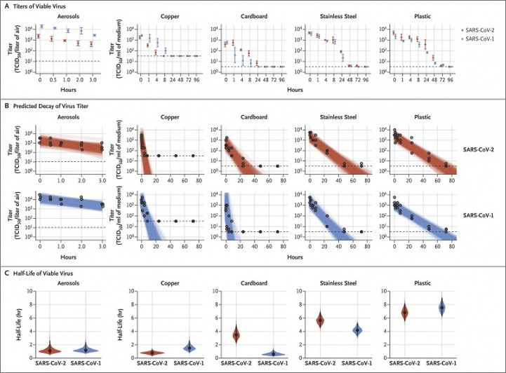 L'étude a montré que le coronavirus reste viable dans les aérosols tout au long de l'expérience de trois heures, c’est-à-dire qu’il peut rester actif dans l’air pendant trois heures. L’étude a également révélé que le virus est plus stable sur le plastique et l'acier inoxydable que sur le cuivre et le carton : il a été détecté jusqu'à 72 heures après l'application sur des surfaces en plastique et en acier inoxydable.