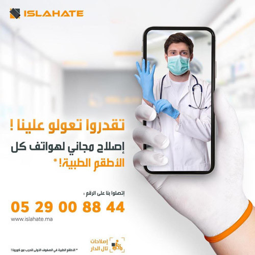 Islahate apporte également son plein soutien aux corps médical confiné et mobilisé pleinement aux côtés des patients et des pouvoirs publics pour faire face à la grave crise sanitaire que nous traversons, et ce à travers la réparation gratuite de leurs téléphones. Ce service inclut aussi le prélèvement et la livraison.