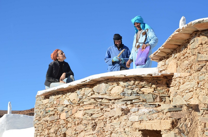 Salima Naji lors des travaux de restauration du grenier Aguellouy, Amtoudi, région Guelmim-Oued Noun. Financement Prince Claus et Global Heritage fund de 20 000 dollars pour la restauration des deux greniers de la vallée d'Amtoudi fortement abîmés suites aux pluies diluviennes de 2014.