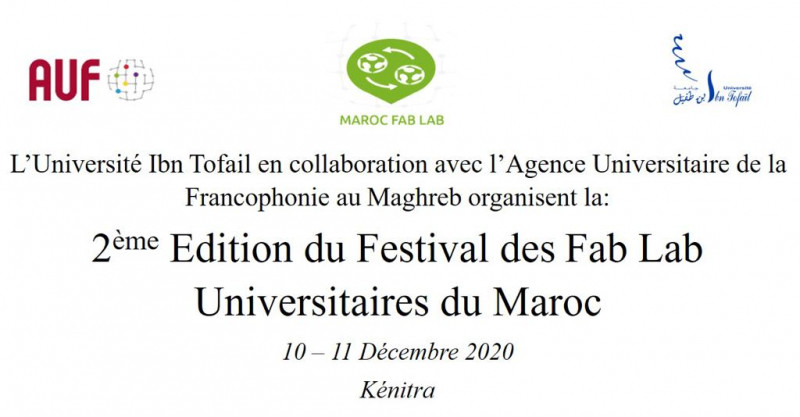 La direction régionale du Maghreb de l’Agence universitaire de la francophonie (AUF) et l’université Ibn Tofaïl organisent la deuxième édition du festival des Fab Lab universitaires du Maroc à Kénitra du jeudi 10 au vendredi 11 décembre 2020.