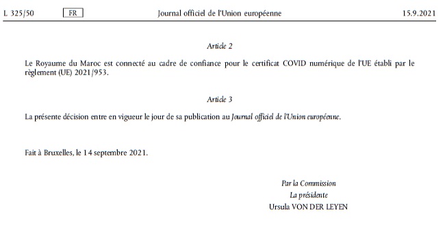 "Aux fins de faciliter l’exercice du droit à la libre circulation au sein de l’Union, les certificats Covid-19 de vaccination et de test délivrés par le Royaume du Maroc conformément au système SGC’Cov sont considérés comme équivalents à ceux délivrés conformément au règlement (UE) 2021/953", lit-on dans le texte de la décision européenne.