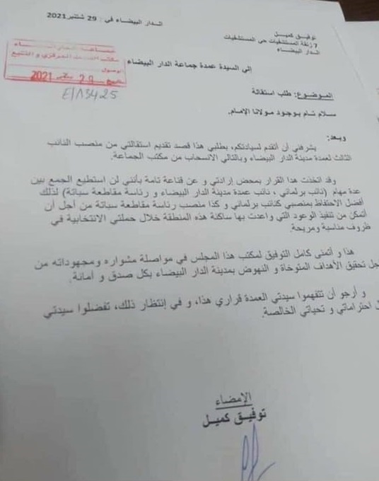 Dans un courrier adressé le 29 septembre à la nouvelle maire de Casablanca, Nabila Rmili, Kamil Taoufik annonce sa démission de son poste de 3e vice-président du conseil de la ville de Casablanca, et ainsi, son retrait du bureau du conseil communal de la métropole.