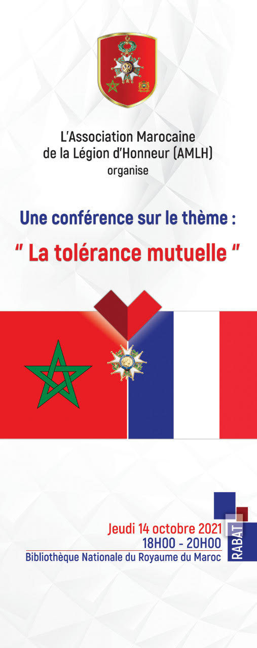 Dans le cadre de ses activités culturelles, l’Association marocaine de la Légion d’Honneur (AMLH) organise, ce jeudi 14 octobre, à la Bibliothèque nationale du Royaume du Maroc, une conférence sur le thème de "la tolérance mutuelle".