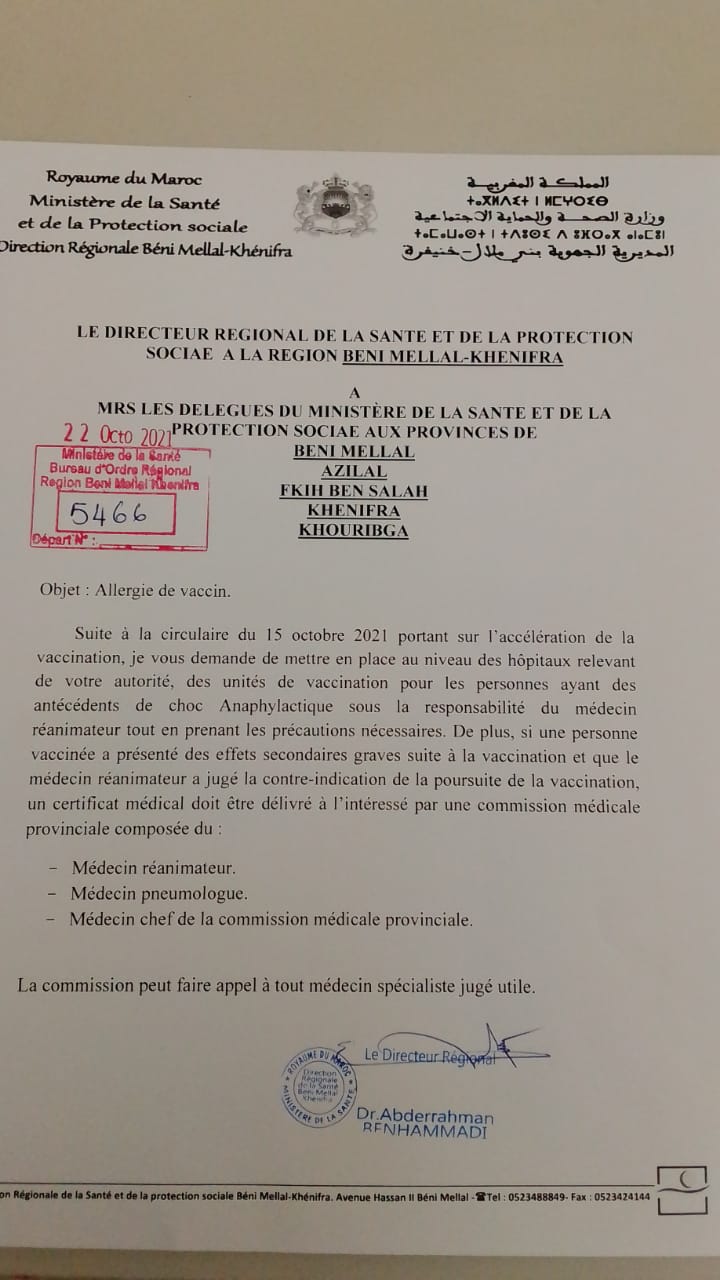 Si une personne vaccinée a présenté des effets secondaires graves suite à la vaccination et que le médecin réanimateur a jugé la contre-indication de la poursuite de la vaccination, un certificat doit être délivré à l'intéressé par une commission médicale provinciale, composée du médecin réanimateur, d'un médecin pneumologue et du médecin-chef de la commission médicale provinciale, comme le stipule la circulaire ci-dessous, adressée par le directeur régional de la santé de Beni Mellal-Khénifra aux délégués du ministère dans les provinces de Beni Mellal, Azilal, Fkih Ben Salah, Khénifra et Khouribga.