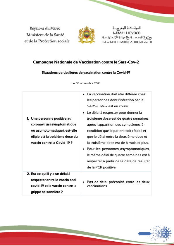 Par ailleurs, à la question de savoir si une personne positive au coronavirus (symptomatique ou asymptomatique), est éligible à la troisième dose du vaccin contre la Covid-19, le ministère explique que "la vaccination doit être différée chez les personnes dont l'infection par le SARS-CoV-2 est en cours".