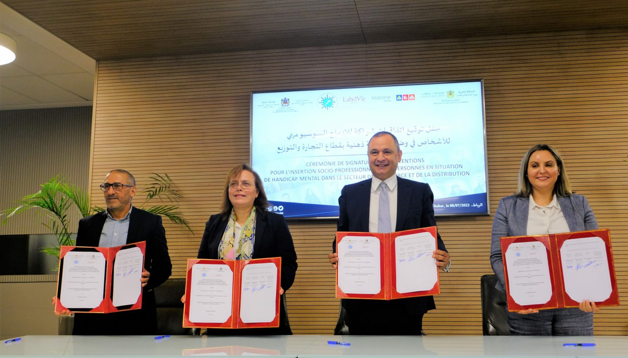 Deux conventions ont été signées par le ministère de l’Industrie et du commerce, le ministère de la Solidarité, de l’insertion sociale et de la famille, l’Union nationale des associations œuvrant dans le domaine du handicap mental (UNAHM) et les groupes Marjane et Label’Vie.