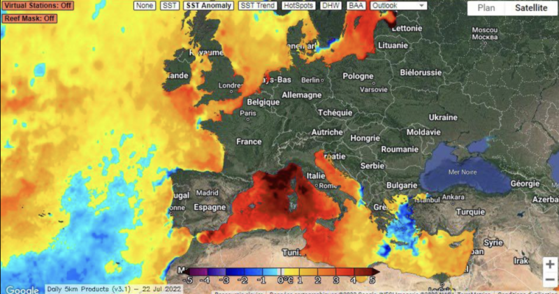 L’anomalie thermique de la Méditerranée occidentale est exceptionnelle, parfois > à 5°C au large de la Provence. #canicule pic.twitter.com/DJ6YvplzNa— Keraunos (@KeraunosObs) July 24, 2022