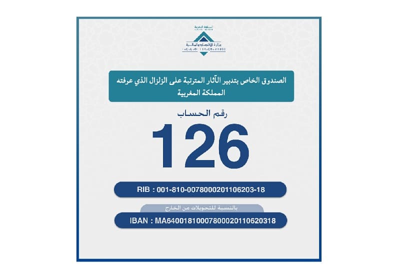 Sur les instructions du Roi Mohammed VI et dans le cadre de l’effort national pour la mise en place de mesures d’urgence pour pallier l’impact du séisme ayant touché plusieurs régions du pays, il a été procédé à la création du Fonds spécial numéro 126 pour la gestion des effets du tremblement de terre.