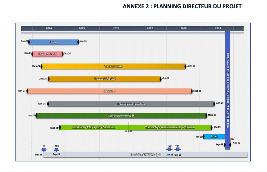 - aux travaux d’équipements ferroviaires et de système, qui devraient pour leur part démarrer en octobre 2026 pour s’achever en mai 2029.
