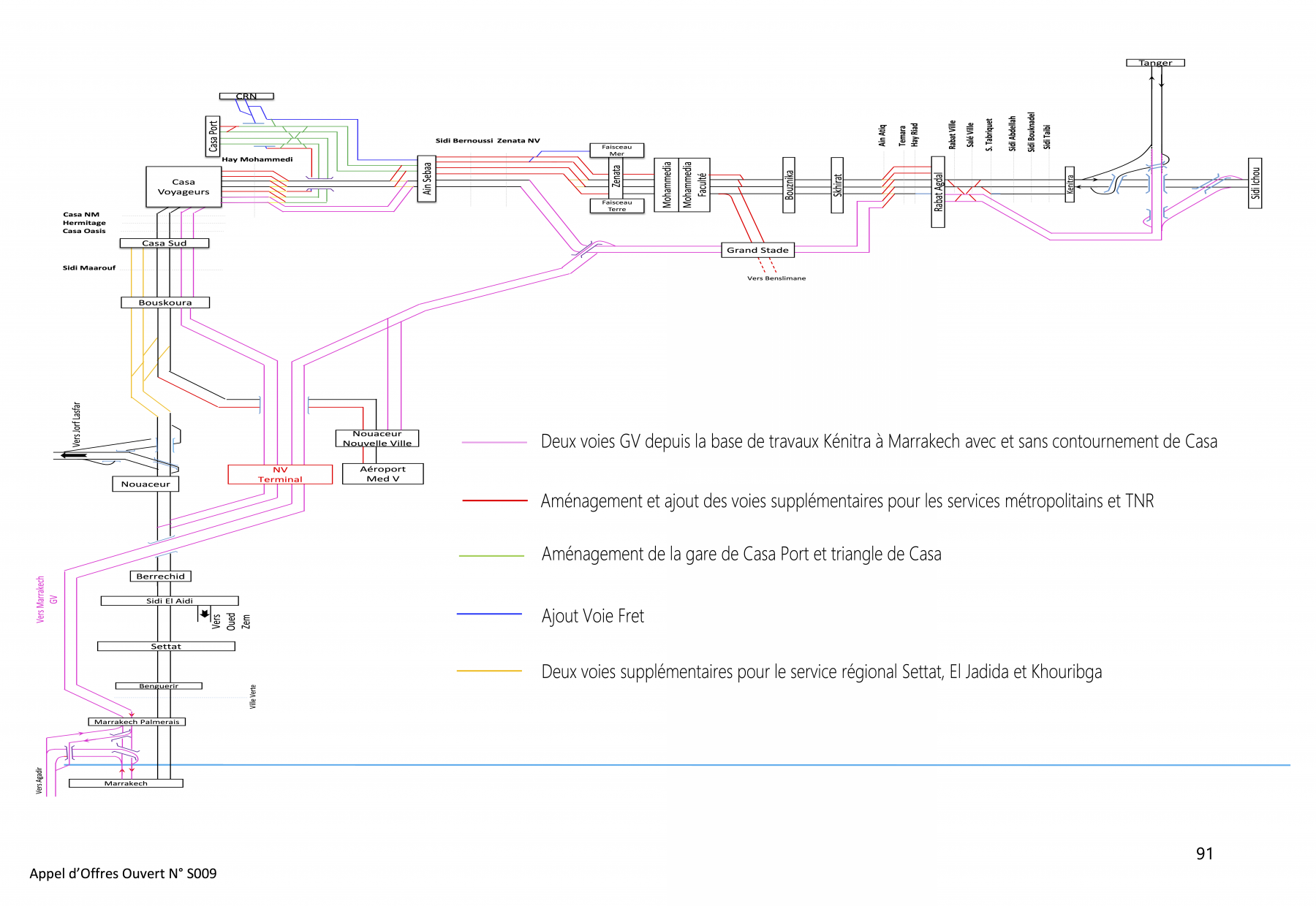 Selon le schéma, deux itinéraires sont envisagées en arrivant à Casablanca. La ligne LGV passera par une voie de contournement de Benslimane (stade) vers Nouaceur, où un nouveau terminal ou hub sera installé pour poursuivre sa route vers Marrakech.