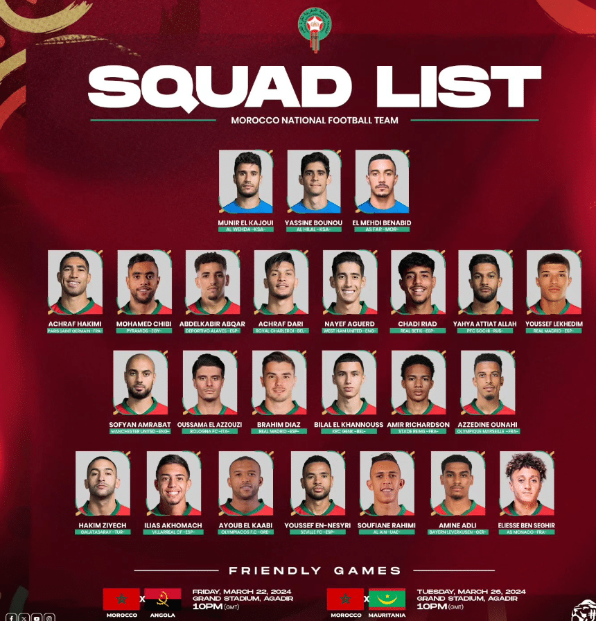 Sur le front de l’attaque, le technicien marocain a également misé sur Ilias Akhomach (Villarreal) et le Monégasque Eliesse Ben Seghir. Les deux pépites marocaines seront épaulées devant par Hakim Ziyech, Ayoub El Kaabi et Youssef En-Neysiri qui retrouve des couleurs avec le FC Séville, après une CAN mitigée. Abdessamad Ezzalzouli n'a pas été appelé.
