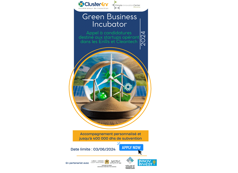 Pour relever le défi d’un développement économique durable à travers la création d’emplois verts, le Cluster EnR et le Moroccan Climate Innovation Center (MCIC) ont lancé en 2014 le Green Business Incubator. Ce dernier a pour mission de soutenir et d’accompagner le développement des startups opérant dans le secteur des énergies renouvelables, des Green Technologies et de l’environnement pour un impact positif et durable sur le développement socio-économique du pays.