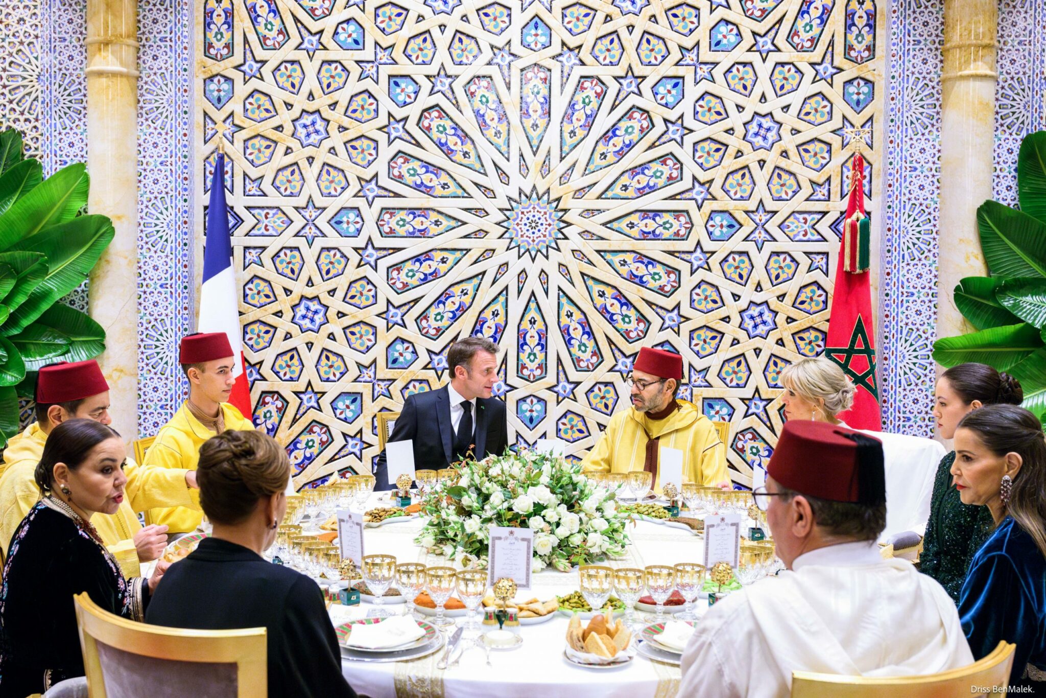 Le Roi Mohammed VI, accompagné du Prince héritier Moulay El Hassan, du Prince Moulay Rachid et des Princesses Lalla Khadija, Lalla Meryem, Lalla Asmaa et Lalla Hasnaa, a offert, le mardi 29 octobre au Palais royal à Rabat, un dîner officiel en l'honneur du président de la République française Emmanuel Macron et de son épouse Brigitte Macron.