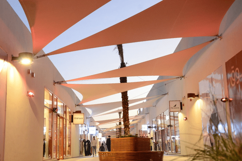 Mazeej Mall s’intègre harmonieusement dans le paysage urbain de la ville en tant que véritable lieu de convergence, s’inspirant des anciens souks et caravansérails sahariens. Son architecture met en valeur l’identité locale à travers des espaces ouverts et aérés. Des structures en toiles tendues, évoquant la culture nomade et la fonction de la tente, assurent une protection contre les éléments – vent et soleil – tout en offrant un cadre agréable et rafraîchissant, décrit le groupe.