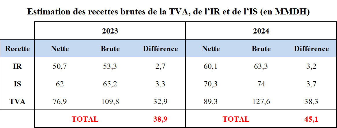 La différence entre les recettes brutes et nettes de ces trois impôts, que nous avons calculée à partir des données fiscales, représente 38,9 MMDH en 2023 et 45,1 MMDH en 2024.