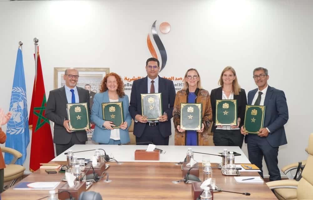 En présence de représentants de départements ministériels et d’établissements publics partenaires de l’ONDH, le partenariat a été cosigné par le président de l’ONDH, Otmane Gair, et les représentants résidents de quatre agences du Système des Nations unies au Maroc, à savoir le PNUD, l’UNICEF, l’UNFPA et l’OMS.