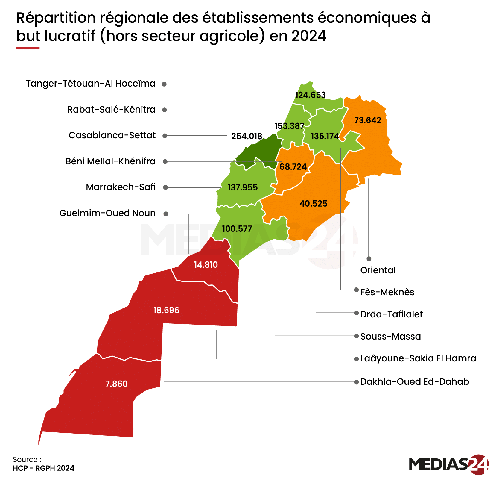 Sur la région Casablanca-Settat, Casablanca seule concentre plus de 147.000 établissements, soit plus que toutes les autres provinces de la région. Autour de ce noyau, El Jadida, Mohammédia ou Berrechid contribuent également à ce dynamisme, mais à une échelle nettement inférieure.