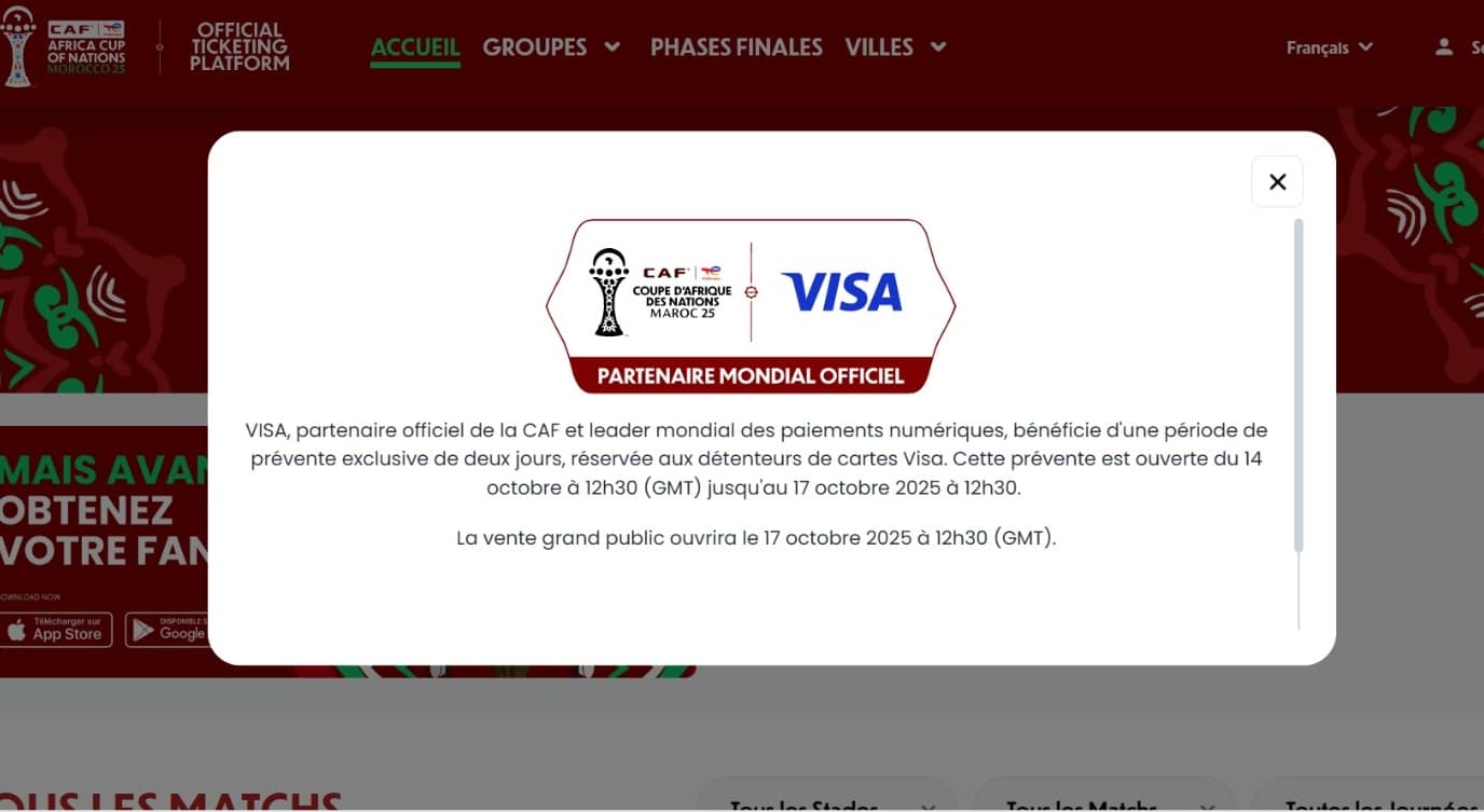 Alors qu'elle devait être ouverte aux détenteurs de cartes Visa le lundi 13 octobre, la prévente des billets de la CAN 2025 vient d'être lancée ce mardi 14 octobre, comme l'a constaté Médias24.