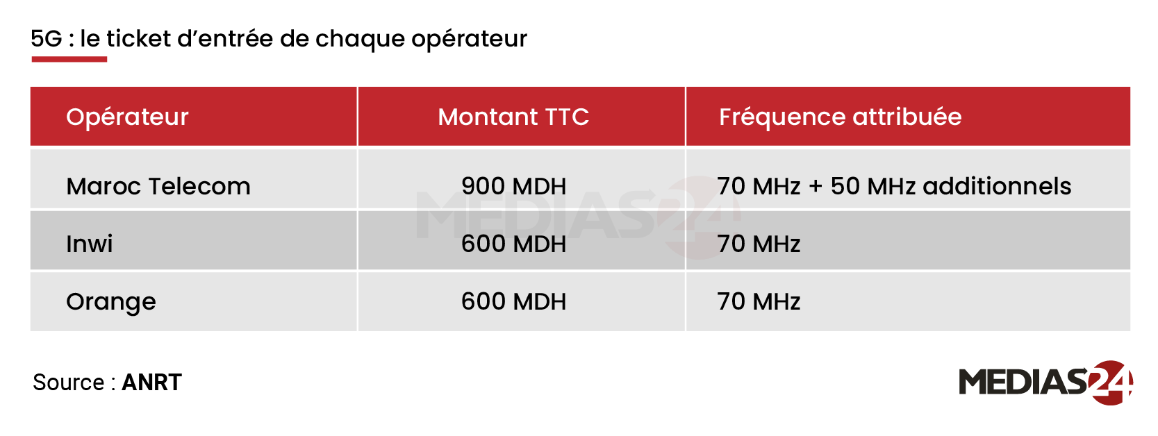 Chaque opérateur a donc reçu 70 MHz pour 600 MDH TTC, avec la possibilité d’acquérir des fréquences supplémentaires moyennant un paiement additionnel. Maroc Telecom, qui ne disposait pas de fréquences 5G contrairement à ses concurrents, a ainsi demandé 50 MHz additionnels et doit les payer, afin de ne pas être décalé par rapport aux autres opérateurs en termes de qualité de service.