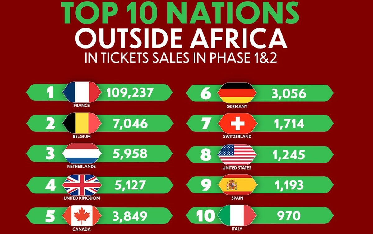 Après la vente des deux tiers des billets pour la CAN Maroc 2025, la Confédération africaine de football (CAF) a publié, vendredi 31 octobre, la liste des dix pays non africains ayant acheté le plus de billets, avec la France en tête du classement.