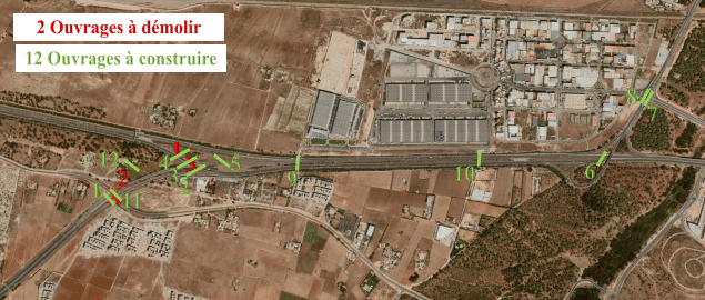 La refonte a donc été plus lourde qu’à Sidi Maârouf. Douze ouvrages d’art ont été construits, avec des voies pouvant atteindre jusqu’à huit par sens, accompagnés de la démolition de deux structures anciennes, de la reconfiguration des bretelles, de la construction d’un carrefour surélevé et de la séparation des flux pendulaires.