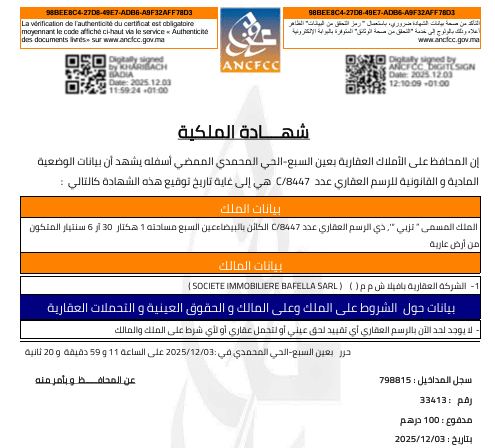 Le terrain est inscrit, actuellement, au nom de la société immobilière Bafella SARL. Ci-dessous un récent titre de propriété obtenu ce 3 décembre 2025.
