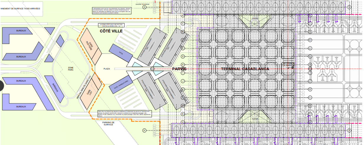 Conçu en forme de "H" avec un processeur central et deux jetées, ce terminal sera relié à la ligne à grande vitesse (LGV) Tanger–Marrakech et intégrera des solutions optimales pour le traitement des bagages, la circulation des passagers et l’utilisation des passerelles.