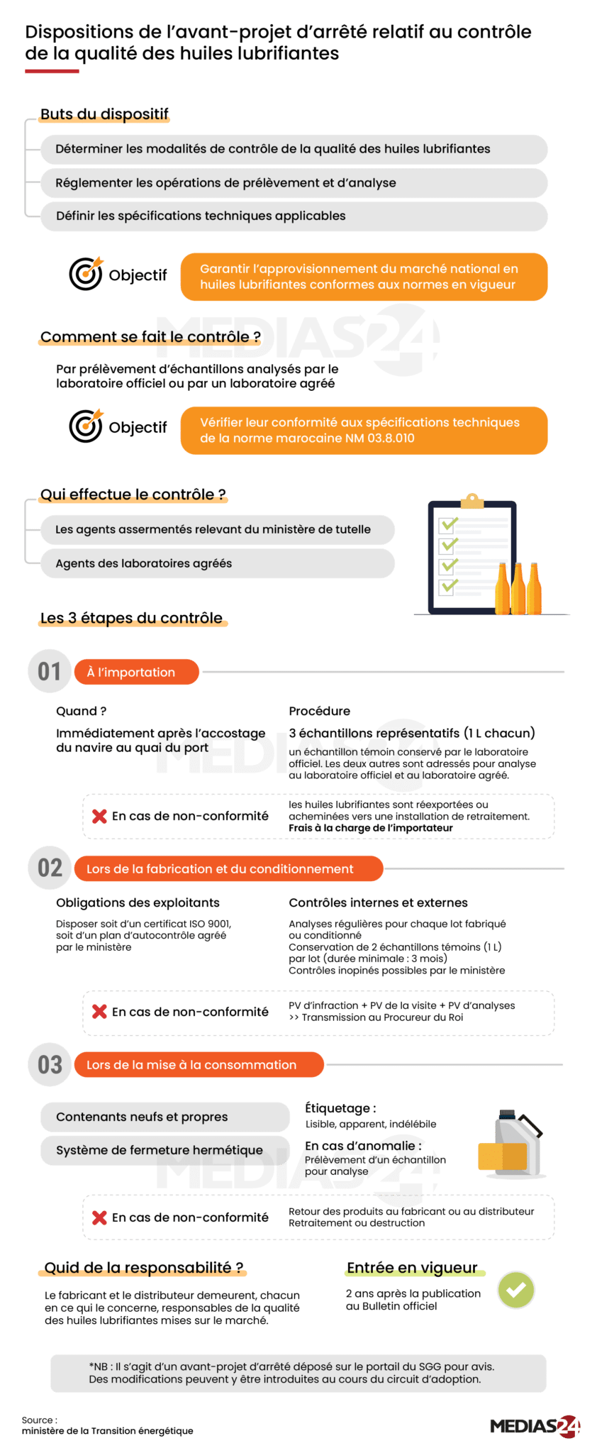 Le contrôle de la qualité des huiles lubrifiantes sera effectué par prélèvement d’échantillons, prévoit l'un de ces textes, en vue de leur analyse par le laboratoire officiel ou par un laboratoire agréé. L'objectif étant de vérifier leur conformité aux spécifications techniques définies par la norme marocaine NM 03.8.010 (relative aux produits pétroliers et lubrifiants – huiles de lubrification pour moteurs à combustion interne).