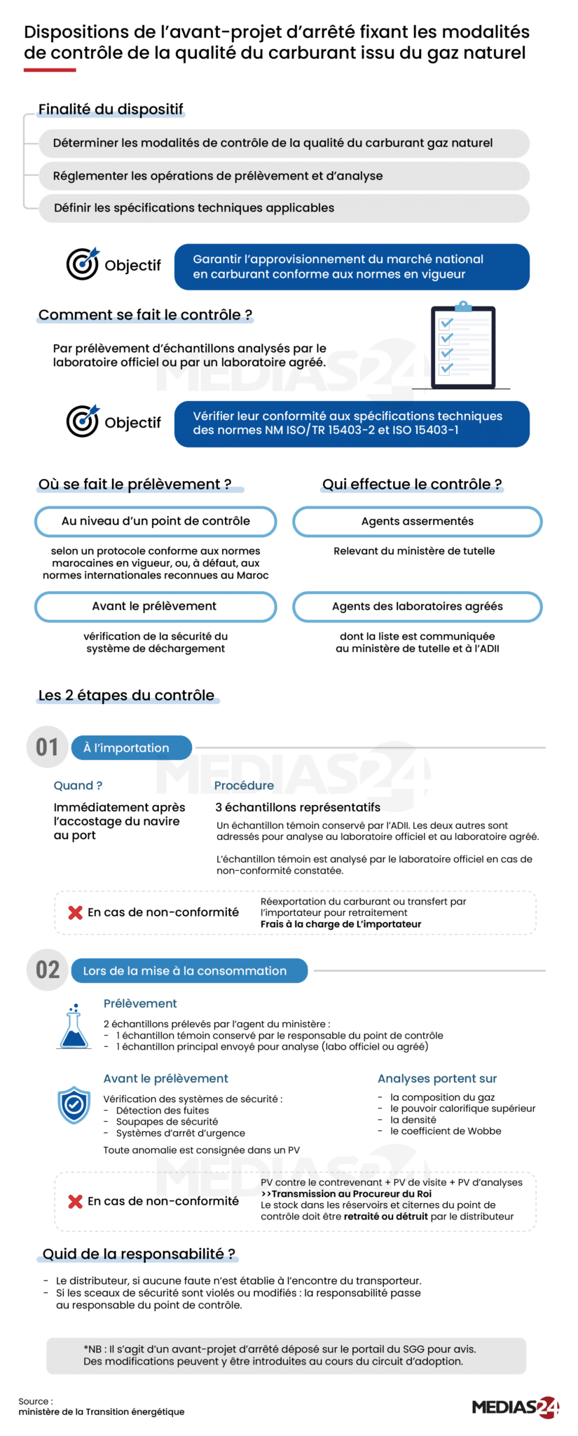 Les analyses réalisées sur le carburant gaz naturel doivent au minimum déterminer la composition du gaz, le pouvoir calorifique supérieur, la densité et le coefficient de Wobbe. Et en cas de non-conformité confirmée, l’agent relevant du ministère de tutelle établit un PV contre le contrevenant, qui est transmis immédiatement, avec le PV de visite et le PV d’analyse, au procureur du Roi compétent sur le territoire du point de contrôle. Dans ce cas, si le carburant non conforme reste stocké dans les réservoirs ou citernes du point de contrôle, il doit être retraité ou détruit par le distributeur, les frais restant à la charge du contrevenant.